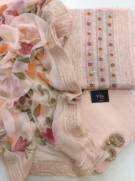 Grab the second look in this Pink colored dress material. This chanderi suit is beautifully adorned with embroidered work as shown, this comes along with heavy santoon bottom, inner and chanderi dupatta which makes it appear more adorning. Women can buy this suit to wear for their festive, homely functions, kitties, weekend get together.