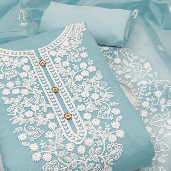 Designed with simplicity with a touch of soberness in its work makes a masterpiece by wearing this blue colored dress material. This beautiful suit is prettified with floral embroidered work as shown which makes it appear classy. The top is made of organza fabric accompanied with santoon bottom, lining and embroidered organza dupatta
